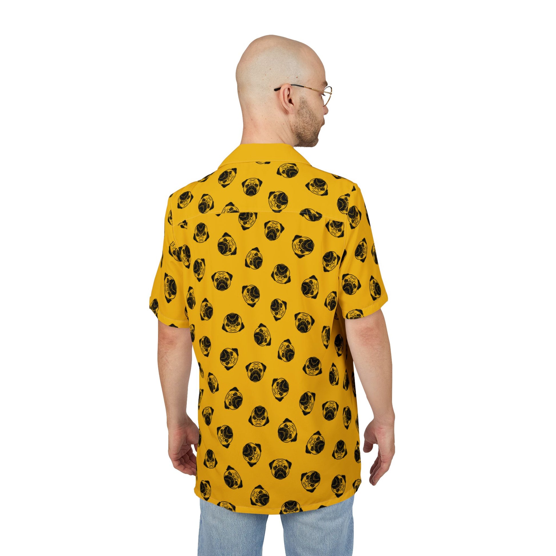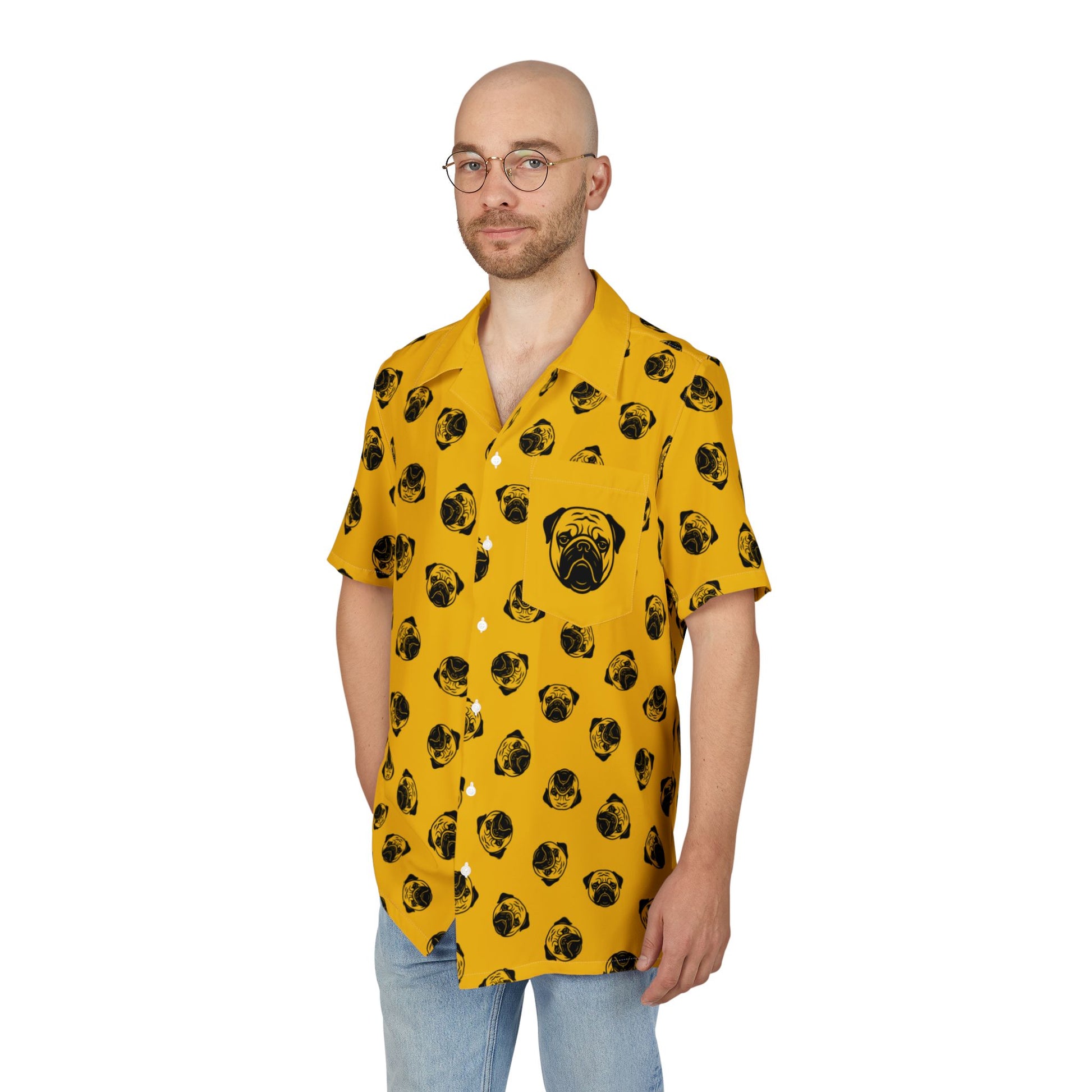 [Yellow] Trendy Pug Print Poogs Logo Hawaiian Shirt, Casual Summer Button-Down, Beach Vibes Shirt, Pet Lover Gift, Fun Vacation Attire, AOP Shirt
